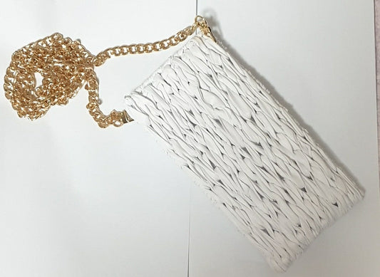 Phone bag. white ribbon yarn, net, strap. magnet button is used. But, we can use it without magnet button, because net is used. The net holds the entrance tightly. (No button,...